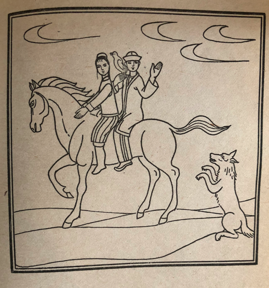 汗想坐得靠近那個(gè)美女一點(diǎn)兒,可是,他剛往前一湊,美女一下子變成了狼,上去把汗抓了個(gè)頭破血流,然后很快地跑掉了。狼又從后面趕上了少年和那位姑娘。少年又對(duì)狼說:“我也不想跟這匹馬分開了,能不能想個(gè)辦法呢?”狼說:“可以?!痹诨氐降谝粋€(gè)汗的附近時(shí),狼又搖身一變,變成了一匹駿馬。少年?duì)恐E馬送到汗那里。汗回謝以后,就給了他那只金絲鳥。少年帶著金絲鳥和姑娘一起騎上馬又走了。