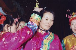 到了預(yù)定的時辰,新娘該“上馬”了。阿姑們將娶親人的馬鞍等物藏起來,并圍著馬頭唱起了《上馬曲》,悲傷的詞曲中阿姑們向即將出嫁的新娘一一道別,對娶親者提出種種要求,只有具備這些條件,新娘才能上馬: