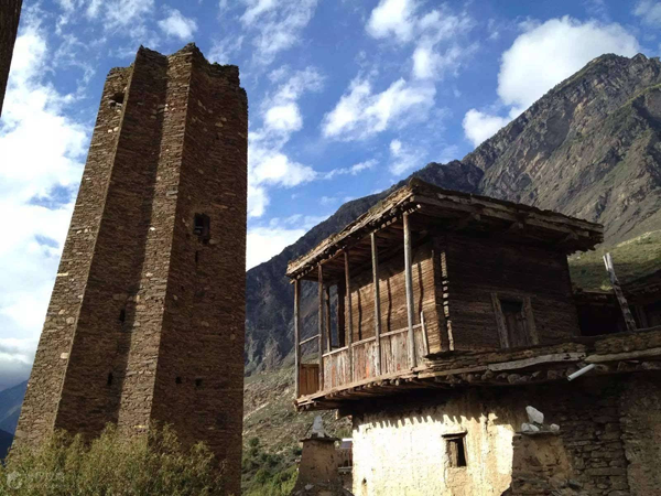 在羌語中,碉樓被稱為“邛籠”,意為美麗、高貴的房子,早在2000年前《后漢書·西南夷傳》就有羌族人“依山居止,壘石為屋,高者至十余丈”的記載。碉樓的高度在十米至三十米之間,用于御敵、貯存糧食和柴草。碉樓有四角、六角、八角幾形式,有的高達(dá)十三四層。建筑材料是石片和黃泥土,墻基深1.35米,以石片砌成。石墻內(nèi)側(cè)與地面垂直,外側(cè)由下而上向內(nèi)稍傾斜。修建時不繪圖、吊線、柱架支撐,全憑高超的技藝與經(jīng)驗。建筑穩(wěn)固牢靠,經(jīng)久不衰。自唐朝來,羌族人民因各種原因向西北遷移,到了西藏和青海,所以現(xiàn)在,羌族碉樓也往往被稱為藏族碉樓。