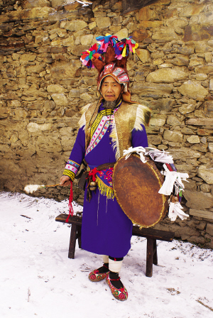 “釋比”是羌族對(duì)宗教儀式執(zhí)行者的尊稱,漢語稱之為“端公”,是羌族文化知識(shí)的集大成者。釋比頭戴的猴皮帽和手中的羊皮鼓現(xiàn)在已成為珍貴的民族文物