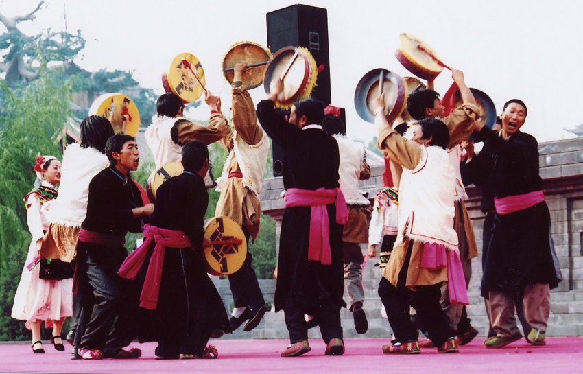 羊皮鼓舞是羌族重要的舞蹈形式。羌族人每遇病、喪之事,都要請巫師跳皮鼓。巫師一般為2人,1人舉短戈在前,1人左手持單面鼓,右手持彎把鼓錘敲擊,并搖晃鼓內(nèi)的小鐵環(huán)嘩嘩作響,開始在一陣吆喝和鼓聲震天的熱烈、緊張氣氛中邊擊鼓邊跳,走步時腳不停的顫動,帶有神秘感。主要步法有:甩鼓步,兩腳八字分開,鼓先落在兩胯之間,然后向上甩,同時擊鼓。兩邊踮跳步,前腳向前跳,后腳以腳尖點(diǎn)地跟出,左右交換擊鼓。還有開胯下蹲跳步、松膝繞步等。也有原地打“旋子”的技巧動作,其動作節(jié)奏明快,激烈而敏捷。一般在老年人死后,跳皮鼓要進(jìn)行3天3夜,死者的親朋故友都要參加跳皮鼓,人數(shù)不限,跟在巫師身后,從右到左,或由左到右地跳動。先成曲線隊形,然后成圓圈。跳皮鼓以表演者手中所持羊皮鼓、串鈴等為伴奏,鼓點(diǎn)種類繁多,相傳過去跳皮鼓的鼓點(diǎn)曾有108種之多。