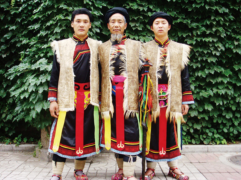 圖片左為楊俊清,中為老釋比朱金龍(楊俊清的老師),右為余正國(原是一名當(dāng)?shù)氐那颊Z老師)。他們是當(dāng)?shù)赜忻尼尡取? 梁黎2008年攝于北京
