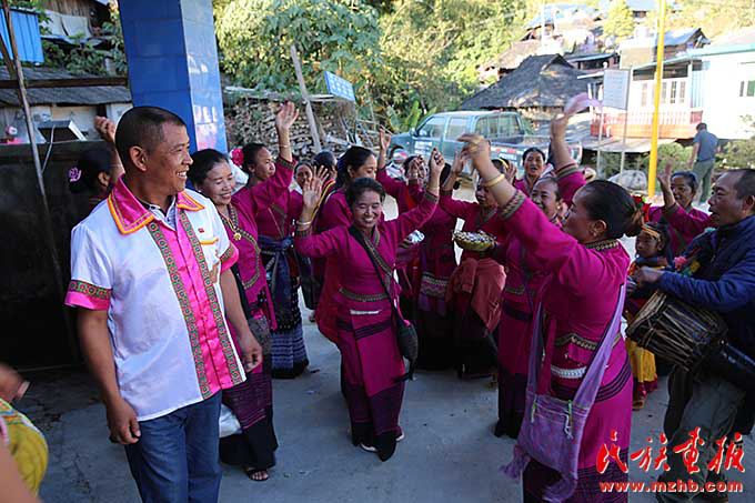 “今天是好日子,是個吉祥的日子,感動天、感動地,所有的布朗族兄弟,我們歡樂來相聚?!辈祭首鍙棾〖墏鞒腥擞窨怖痛迕褚黄鸪似饋?。