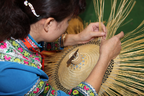 三角鉤鋤是毛南族特有的生產(chǎn)工具,毛南語叫“拱”。它小巧輕便,適合在雞窩地里中耕鋤草,又用于點(diǎn)種黃豆。種黃豆還有一種木制的“點(diǎn)穴錘”,用8寸到1尺長的金剛木削成圓桿,形如搟面杖,中間插一木柄,手握木柄在泥土里一錘,就成一個(gè)如雞蛋形的坑,即可放入黃豆,蓋上草木灰。這種“點(diǎn)穴錘”一錘一穴,工效很高,是種黃豆的最佳農(nóng)具。此外還有禾剪、割煙刀等(圖為毛南族織錦)。