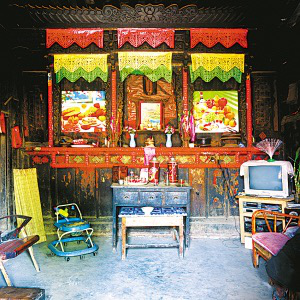 隴川縣戶撒鄉(xiāng)曼旦寨是阿昌族古老的村寨之一,明、清時期的老宅皆以楠木建造,數百年不朽、無蟲蛀。受漢族文化影響,傳統(tǒng)民居大都是土木石結構的三合一照壁或四合院落。正房建在長方石條加土方壘起的屋基上,屋基下為院壩,以三層石階上下。正房三開間,四排五柱,中柱起脊,形成雙斜面屋頂,上覆凹型青瓦。后墻和兩側山墻以土坯砌筑,外面不抹泥,左右是廂房或照壁。室內隔墻均為木板,中間一間為堂屋,有一米多寬的吞口,六扇雕刻的木板門,平時只開中間兩扇。兩邊的檐柱頭有粗獷的木雕。吞口有走廊的作用,一般左側角設臉盆架以供洗漱,板壁上掛小鏡框以便梳妝,旁邊掛著家人的照片。有的擺著縫紉機,有的放藤椅小憩。右側放臨時的農具,掛衣服,板壁上貼著影視明星的招貼畫。堂屋正面板壁是通高的木雕佛龕,供奉佛像和傣文的經文,龕楣上貼著三至四層掛錢,下面有燭臺、香爐。左側擺著電視機、熱水瓶、茶桌,板壁上掛著戶撒刀和手工編織的背兜,右側有專供老人休息的床或藤椅,也有的砌火塘,火塘的小土臺上放著炒菜的調料、火柴和照明燈具。