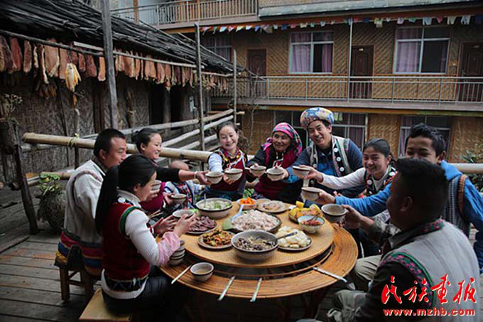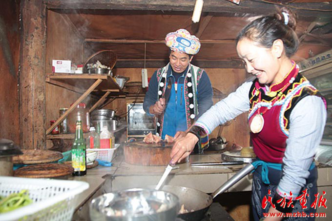 早上,老姆登村73歲的怒族老人斯普早早起來招呼兒子郁伍林、兒媳魯春花:“春節(jié)快放假了,客棧的生意會(huì)忙得不可開交,趁著現(xiàn)在客人不多,家里人先吃一頓團(tuán)圓飯吧?!彼蛊绽习樵缒赀^世,7個(gè)兒女中老五郁伍林在身邊照顧她?!斑^去在春節(jié)才能吃上一頓好飯菜,也要準(zhǔn)備很長(zhǎng)時(shí)間,現(xiàn)在每天都有好吃的,天天在過年,多虧了黨的好政策?!闭f起今天的幸福生活,生在舊社會(huì)的斯普感慨萬千。