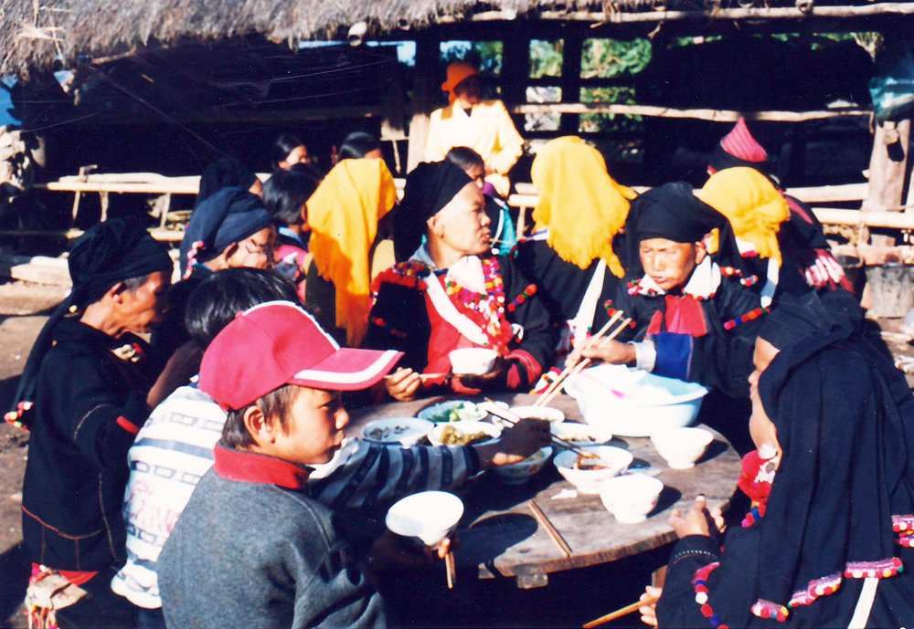 在舉行婚禮的三天內(nèi),全村寨的人們都要到新郎新娘家做客,自己家里則無需生火做飯。新郎新娘的親戚朋友和小伙伴們都會來幫助料理結婚的有關事務,男女兩方家里都忙忙碌碌,喜氣洋洋。頭一天晚上,男女雙方家里賓客盈門,一派熱烈的節(jié)日景象。新郎的父母拿出香醇的米酒,請賓客開懷暢飲,新郎則跟在后面,給每一桌客人磕頭作揖,并接受賓客的祝賀。當天晚上,新郎新娘分別在各自的家里挎著筒帕,里面裝著草煙、蘆子、沙基和石灰盒,把同村寨的姑娘、小伙子請到客房里,請他們抽草煙、嚼檳榔。