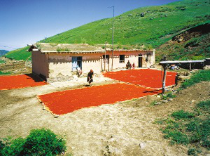 土房的室內(nèi)除有的搭火炕外,其它的裝飾和木房的一樣。到了采收紅花的季節(jié),鮮紅欲滴的紅花曬滿了院子,形成獨特的風景。不論哪個房間,都可作為臥室,也用于待客,廚房和儲藏室單建,有的還單建馕坑。