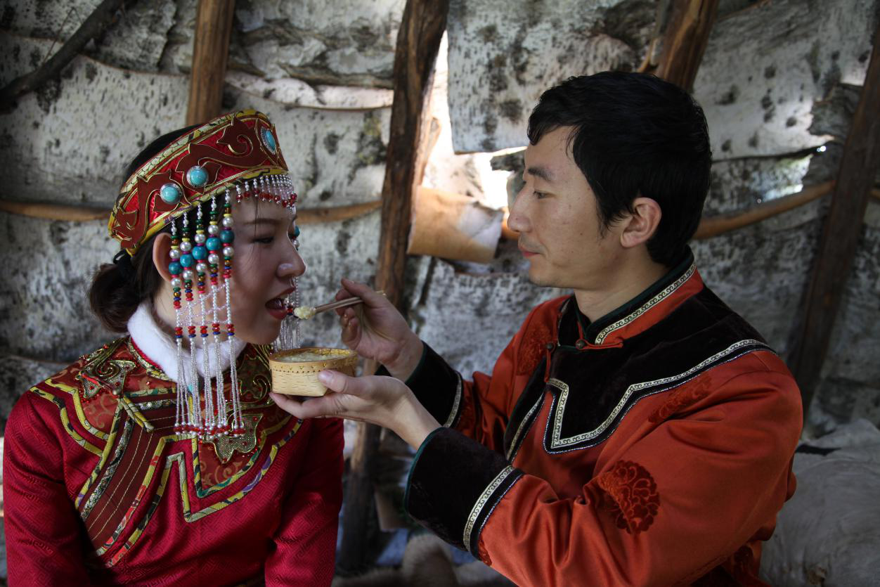 女方的父母不參加女兒的婚禮和婚宴,送親的人返回時,要給他們捎回一份最好的酒肉。男女雙方如果同在一個“烏力鄰”,婚后三日新郎陪新娘“回門”,探望新娘的父母,但不能留宿,要當天返回婆家。如果雙方“烏力鄰”相距較遠,結(jié)婚一個月后,小夫妻騎馬回娘家探親,不僅探望父母,還要拜訪所有的親屬,可以留住幾天甚至幾個月。