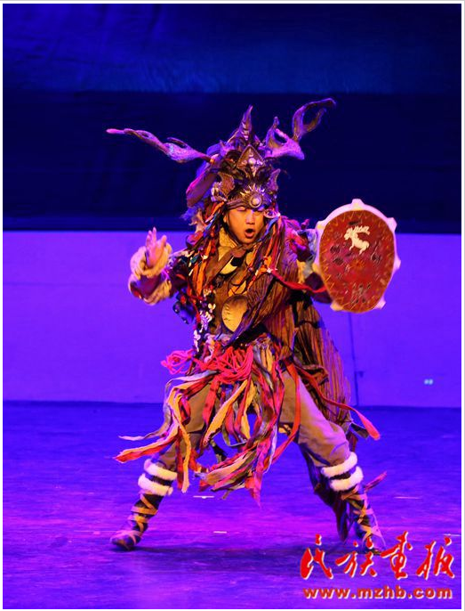 大型原創(chuàng)民族歌舞詩劇《山嶺上的人——鄂倫春》在國(guó)家大劇院上演,圖為歌舞詩劇第一幕《山語》之情景表演《圖騰印象》