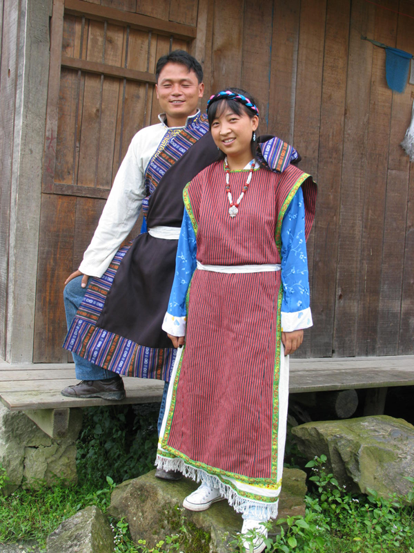 門隅地區(qū)的男女都喜愛用羊毛織品氆氌為原料,穿氆氌袍和絳紅色的長袍,腰間系一條赭色腰帶;女子內(nèi)衣以棉織和蠶織品做原料,顏色絢麗多樣,無開襟、無領(lǐng)、無扣子,只開一個圓口或三角口由頭套穿。外加長袍及上身穿黑氆氌做的“熱故”(門巴語,留有邊子的短服),下身腰部圍一塊白氆氌做的“吉瑪”(門巴語,圍裙)圍裙,并在圍裙右下角綴有“雍仲”(藏語,意為堅固、永固。原始宗教苯教奉為神秘字,并以左旋逆時針方向之形字紋作為代表)吉祥圖案,有的繡有“日月吉祥”圖案。