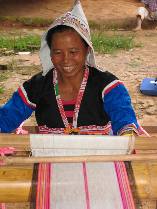基諾族豎線花紋的衣料是獨具民族特色的基諾族織錦“砍刀布”。織錦底布是手捻粗白線,由成年的基諾族女子用腰機(jī)親手織造而成,經(jīng)過米湯漿洗,變得非常挺括,雖然不潤滑,缺少無光澤,但卻厚實耐用,是基諾族獨特的衣料之一。