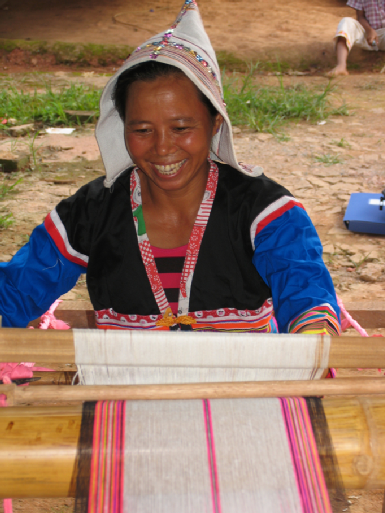 基諾族織錦色線(xiàn)的染色工藝有其獨(dú)特之處。染黑(青)布,采“咪叭”(即板藍(lán)根)鮮葉泡化去渣,加入石灰水?dāng)嚢璩浞趾蟿?,煮水,把布投入水中翻?dòng)多次,撈出曬干即可,煮泡越透色越深。若染青色,只要浸泡一會(huì)即可。染黃線(xiàn),采“合詩(shī)阿波”花(鼠鞠草)與線(xiàn)同煮即可。染綠色,采一種藤“阿紐克帕”和一種樹(shù)“資奪帕”的鮮葉與線(xiàn)同煮,加石灰水少許即可。染紅線(xiàn),用“阿納切”樹(shù)根、“樸臘突”樹(shù)皮和紅高粱殼,加石灰水與線(xiàn)同煮即可。