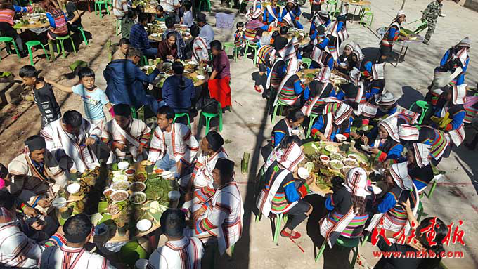 “過去過節(jié),手頭拮據(jù),經(jīng)常是三五戶人家湊錢殺一頭豬。由于物質(zhì)匱乏,節(jié)日前,男女老幼都上山挖野菜,殺豬當(dāng)天,到地里砍芭蕉花,帶上柴火去寨老家里煮年飯吃,節(jié)日第三天去寨老家唱歌跳舞。” 記者聆聽著87歲基諾族老人周白講述基諾山寨的回憶。如今的他已是四世同堂,在耄耋之年能享受天倫之樂,過上幸福生活,他心存感激。節(jié)日當(dāng)天老人們?cè)诖逦瘯?huì)聚餐,席間接受年輕人的敬酒與祝福,其樂融融。