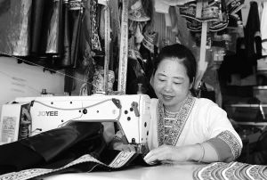 廣西柳州市融水苗族自治縣苗家小鎮(zhèn)是一個易地扶貧搬遷社區(qū),自2017年群眾陸續(xù)入住以來,當(dāng)?shù)卣诩訌?qiáng)和完善基本公共服務(wù)設(shè)施的同時,通過創(chuàng)辦扶貧車間、成立小微市場和鼓勵自主創(chuàng)業(yè)等方式,多措并舉保障和提升搬遷群眾的就業(yè)質(zhì)量,目前已實現(xiàn)“一戶一人就業(yè)”共1586戶3824人,占總戶數(shù)的98%。搬出大山的群眾迎來了新的生活,開啟了新人生。蒙瓊丹是融水縣桿洞鄉(xiāng)桿洞村搬遷戶,她在照顧兩個小孩讀書的同時開了家苗衣店,月收入2000元。圖為8月30日,蒙瓊丹在制作苗族服裝。 龍濤攝影報道