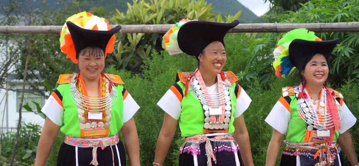 五星村苗族女性服飾顏色亮麗,做工精細。女子頭戴黑色百褶帽,百褶帽形似一只船,在其尾部還裝飾有用絲巾制作而成的花朵。上身則多以黃綠色打底的對襟短衣,對襟處繡有花紋圖案作為描邊,對襟上裝有銀飾圓牌。女子胸前還大多佩戴銀項圈,身后則穿戴背牌。背牌做工極為精細,刺繡圖案豐富。圖案多以幾何和花草為主,背牌上部裝飾有兩排對稱的銀牌,左右也裝飾有對稱的銀鎖。背牌中部是一個倒三角銀飾,銀飾上雕刻有蝴蝶圖案。女性服飾下裳主要分為三個部分,底部為黑色打底長褲,中層為黑色打底的百褶裙,上層則為黑色打底的圍腰。圍腰底部繡有花紋圖案裝飾,圖案內(nèi)容多以花草為主。腰部系有腰帶,腰帶上刺有花紋圖案且顏色較為鮮艷。女性服飾身后還垂有四條絲帶,絲帶上也繡有大面積的花紋圖案,服飾整體充滿民族氣息。