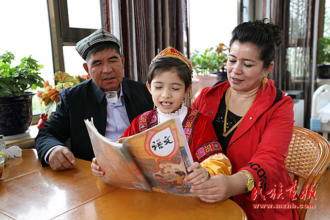 木合塔爾·艾比布拉夫婦教授7歲小女兒學(xué)習(xí)國(guó)家通用語(yǔ)言。