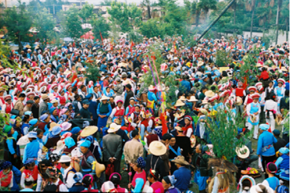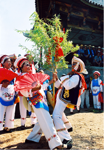 “繞三靈”活動的特點(diǎn),除了向本主神靈祈求風(fēng)調(diào)雨順的內(nèi)容之外,主要在于其歌舞活動所表現(xiàn)的男女情愛無所顧忌,放達(dá)不拘。每個(gè)歌舞隊(duì)列領(lǐng)頭者均為男女巫二人,他們以一手共執(zhí)一株齊人高的樹枝,另一手分別揮舞牦牛尾和花手巾,邊舞邊唱,引領(lǐng)著隊(duì)伍緩緩前行。樹枝上掛著紅綢系著的葫蘆,據(jù)說葫蘆象征母腹,紅綢象征陰血。他們口唱的調(diào)子稱“活恩枯”直譯為“花柳曲”,一唱一和,幽默風(fēng)趣。其后的歌舞隊(duì)列,唱的也都是充滿艷情的調(diào)子,跳的是霸王鞭和八角鼓舞,舞姿多有男女背靠背、心合心、腳勾腳等形式,無拘無束地表達(dá)著熾熱的情感。