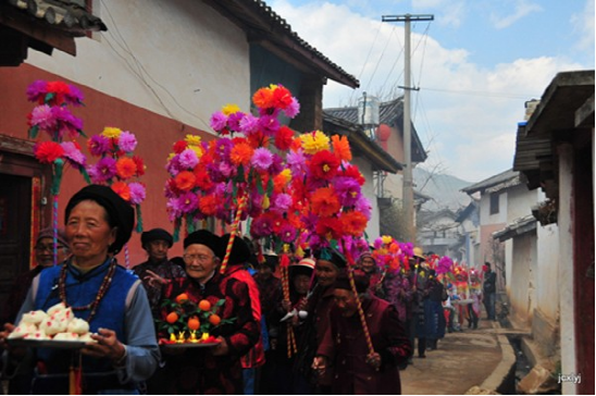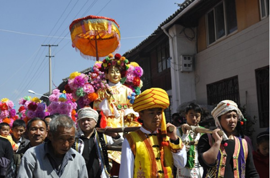 農(nóng)歷二月初六,迎太子入城。這一天在佛教徒的帶領(lǐng)下,人們焚香沐浴,衣冠整齊,虔誠地將“太子”(用布扎油漆制成的太子行像)請(qǐng)到行宮或本主廟里。這一年的新郎為太子抬轎,希望能得到太子的保佑而使新婚的妻子孕生男兒。