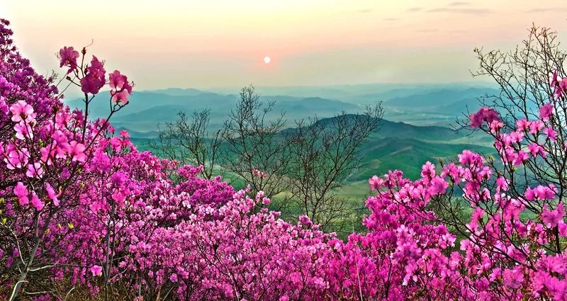 罕山五月杜鵑紅,蜂蝶繞花叢。白樺亭亭玉立,翠枝仰望蒼穹。茵茵綠草,牛羊遍谷,溪水淙淙。游客最佳去處,飲茶騎馬登峰。