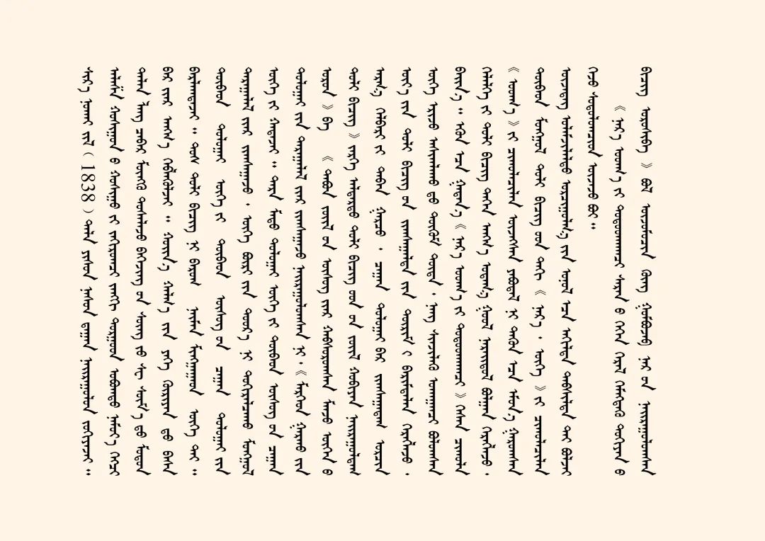 藏蒙對照詞典《詳解月光辭典》又稱《浩月輝映詞典》,該詞典由阿拉善拉隆巴阿旺丹德爾編著,清道光十八年(1838)北京嵩祝寺木刻本。1卷,139葉,頁面尺寸10.6×56厘米,版框尺寸7.5×49厘米,四周雙欄,梵來裝。每頁以藏蒙、藏蒙四行為階梯排列,每列35行,每行1字。頁面左側有藏文頁碼,右側有漢字《永》和漢文頁碼。