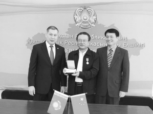 10月17日,艾克拜爾(中)被授予哈薩克斯坦外交部建立外交關(guān)系25周年金質(zhì)獎?wù)?,哈薩克斯坦駐華大使沙赫拉特·努雷舍夫(左)為其頒發(fā)了獎?wù)隆?/span>