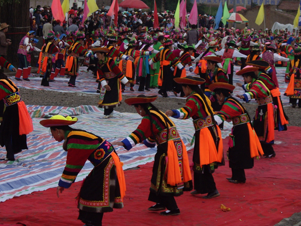 不同地區(qū)的土族舞蹈具有相對(duì)獨(dú)立性,互助的“安昭”、民和的“納頓”、大通的“踏灰”、同仁的“於菟”、甘肅卓尼的“嘎?tīng)枴钡仁亲罹叽淼拿耖g舞蹈?!鞍舱选保琳Z(yǔ)稱之為“千佼日”,意為“彎曲”或“轉(zhuǎn)圈”,是土族民間喜慶節(jié)日和婚禮儀式中,用于禮贊祈祝的一種圓場(chǎng)群舞,也是一種歌舞結(jié)合、無(wú)樂(lè)器伴奏的集體舞蹈。一般由男女各半圍成圓圈,由一男子帶領(lǐng),一唱眾和。舞蹈動(dòng)作簡(jiǎn)單質(zhì)樸,舞者兩手由右胯旁起向左上方至右上方劃圓弧,變?yōu)樽笫智谀X前,右手高居于后,似雄鷹翱翔于藍(lán)天。“於菟”舞即虎舞?!办遁恕?,是古代楚人對(duì)虎的方言稱謂。每年農(nóng)歷十一月二十日祭山神時(shí),名為於菟的舞者在赤裸的上身繪制虎豹圖案,模仿虎的形象“前端腿跳”舞蹈,達(dá)到祀神驅(qū)邪、祈求平安的目的。