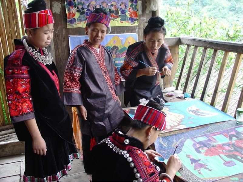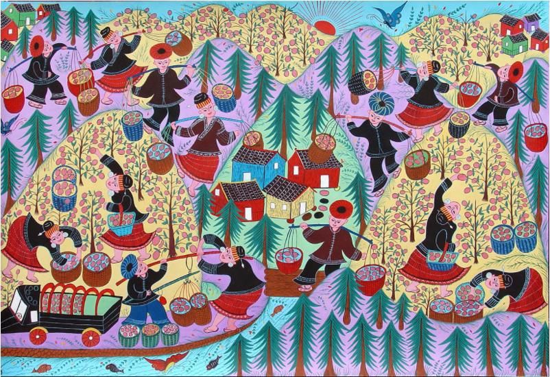 劍河現(xiàn)代民間繪畫源于傳統(tǒng)的苗族刺繡文化,是苗族刺繡文化的另一種表現(xiàn)形式和藝術(shù)升華。傳統(tǒng)的苗族文化多以服飾、歌舞為載體,并以刺繡及演唱等形式進(jìn)行表現(xiàn)和傳承。早期劍河現(xiàn)代民間畫即脫胎于具有適用性的苗族刺繡樣稿——剪紙和手繪刺繡粉本,換言之,手繪的苗族刺繡粉本便是劍河現(xiàn)代民間繪畫的雛形,劍河第一批優(yōu)秀的現(xiàn)代民間畫作者,即是原當(dāng)?shù)厥掷L粉本的能工巧匠。劍河現(xiàn)代民間繪畫多以苗族神話傳說中的故事情節(jié)和民俗節(jié)日、生產(chǎn)活動(dòng)等內(nèi)容為題材入畫,素材涵蓋自然界花鳥蟲魚及人物、家畜等具體形象,造型稚拙天真,設(shè)色濃艷,對(duì)比強(qiáng)烈。作品傳達(dá)出典型的地域民俗氣息及濃厚的鄉(xiāng)土味,便是其標(biāo)志性特征。