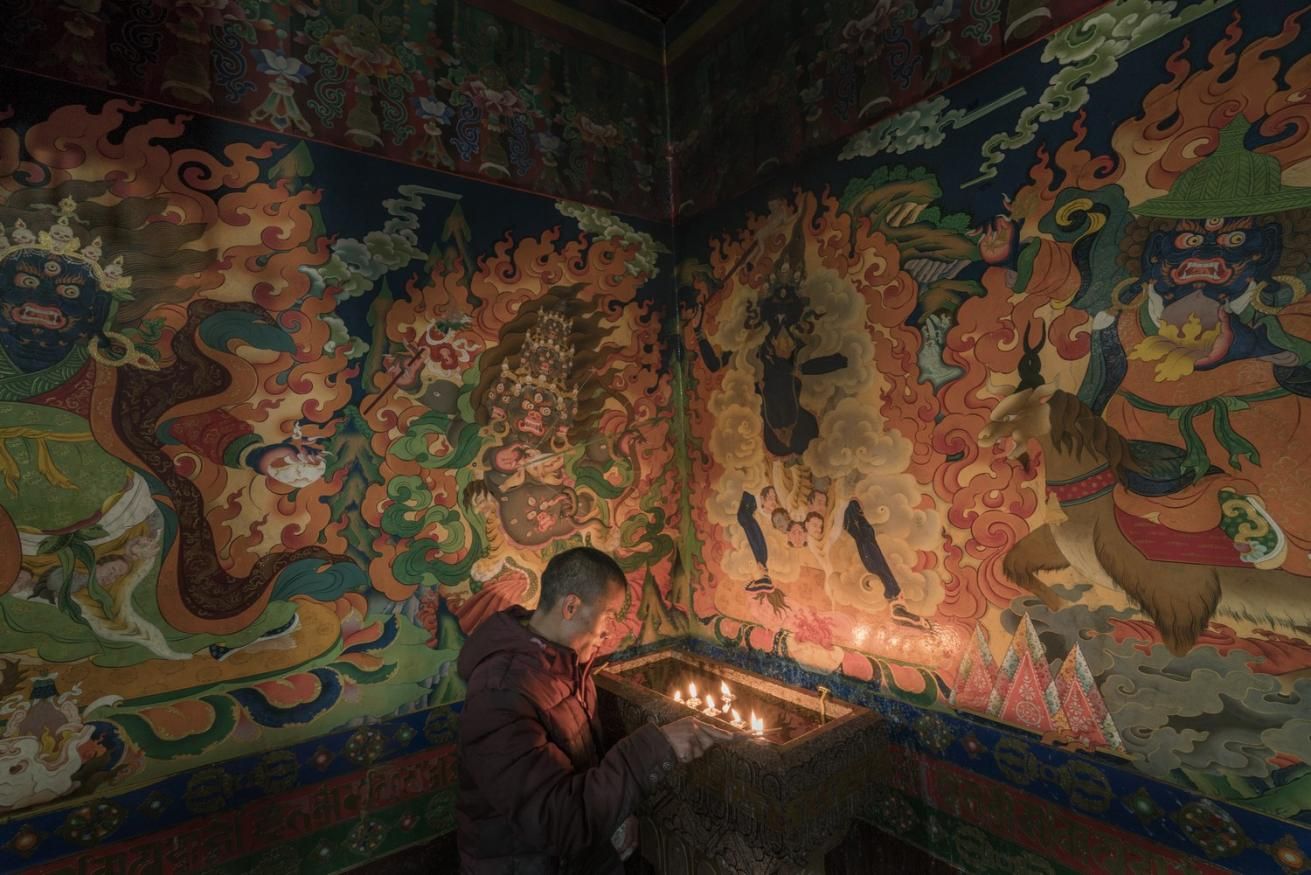 西藏壁畫(huà)分布在寺廟、府第、宮殿、民宅、驛站、旅店等地方的墻壁上。而寺院則為壁畫(huà)聚集之所,大寺院往往有數(shù)十個(gè)到數(shù)百個(gè)殿堂,各個(gè)殿堂及其周?chē)呃鹊膲Ρ?、天花板等處均繪滿(mǎn)了壁畫(huà),如果把這些壁畫(huà)一幅幅地排列起來(lái),那確實(shí)是延綿不斷、絢麗多姿、色彩繽紛的美麗畫(huà)廊。