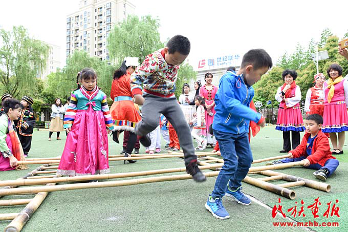 畬族的“摘柿子”、維吾爾族的“賽馬”、黎族的“跳竹竿”、蒙古族的“射箭”……天恒名都幼兒園的操場(chǎng)上,孩子們正積極參加各種民族游戲活動(dòng),沉浸在無(wú)憂無(wú)慮的快樂(lè)中。4月13日,是上海市莘莊工業(yè)園區(qū)天恒名都幼兒園的“民族接力棒小社團(tuán)”活動(dòng)日,孩子們非常期盼這每周一次的活動(dòng)日。