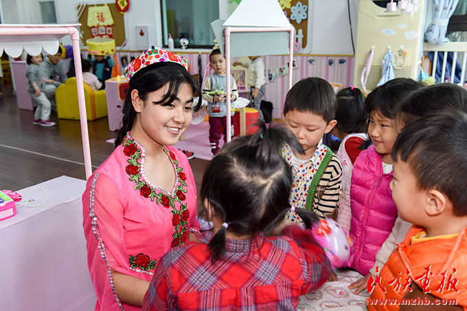 自2014年首場(chǎng)“民族風(fēng)吹進(jìn)幼兒園,愛(ài)心曲唱暖身邊人”公益活動(dòng)獲得積極反響后,幼兒園黨支部、工會(huì)、團(tuán)支部牽手園區(qū)民族團(tuán)結(jié)共建單位,走出校園、貼近社區(qū),以愛(ài)心義賣(mài)、義拍、定向捐助等方式為園區(qū)少數(shù)民族困難家庭送去關(guān)懷。在近幾年的園區(qū)民族工作實(shí)踐中,天恒名都幼兒園的“家、校、社、企”聯(lián)動(dòng)模式不斷發(fā)展創(chuàng)新,培育孵化出少數(shù)民族(幼教)實(shí)習(xí)點(diǎn)、少數(shù)民族志愿者服務(wù)隊(duì)等形式的實(shí)習(xí)模式。2013年至今,幼兒園已為上海市群益職業(yè)技術(shù)學(xué)校的“新疆班”學(xué)生210人次提供了實(shí)習(xí)崗位。