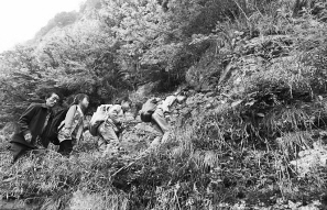 教師楊紹書和學(xué)生們在崖壁上的小路行走。