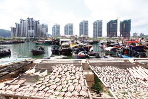 疍家人晾曬海魚的對面聳立著一座座高樓(2007年攝)。