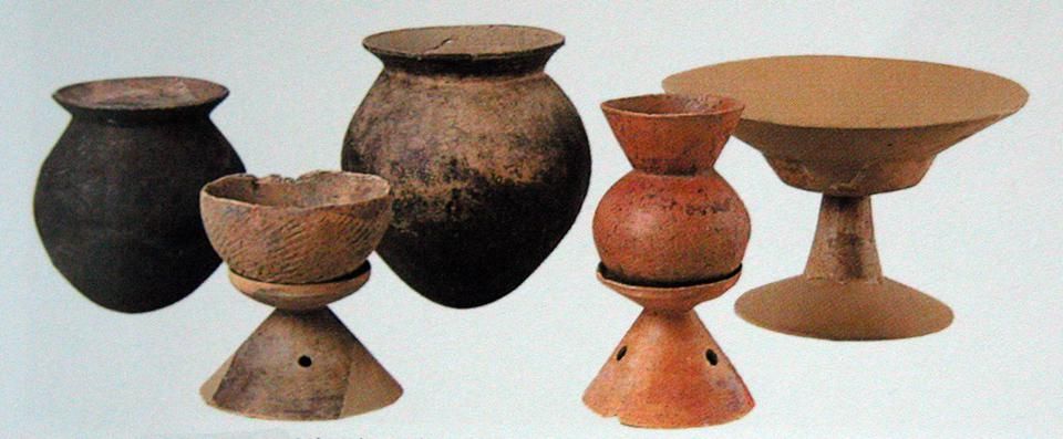 彌生時代的名稱,源自1884年東京市本鄉(xiāng)彌生町“彌生陶器”的發(fā)現(xiàn)。彌生陶器與繩紋陶器截然不同,為素面,灰色。日本人認(rèn)為彌生陶器是“渡來人”制造的。“渡來人”是中國大陸通過朝鮮半島而來,他們帶來了陶器的制作技術(shù)。彌生陶器為深釜器,以甕形器、缽形器、高腳杯(豆形器)為主(圖五)。