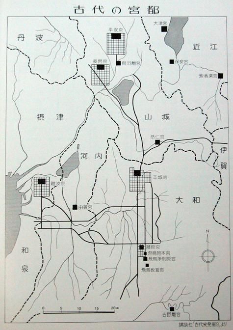 日本在這一時期開始建立自己的宮殿,在此之前都是茅草屋,并開始不斷遷都,整體都城呈現(xiàn)出從南向北而遷的趨勢(圖十九)。