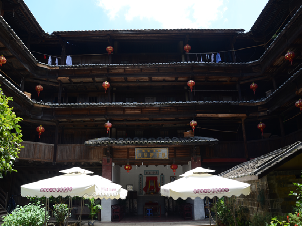 一座土樓就是一個(gè)藝術(shù)殿堂。每一座土樓,又如同一個(gè)“大家族,小社會(huì)”。土樓內(nèi),居住在同一屋頂下的幾十戶幾百人同祖同宗同血緣同家族,過著共門戶、共廳堂、共樓梯、共庭院、共水井的和睦生活。這種聚族同樓而居的生活模式,典型地反映了客家人的傳統(tǒng)家族倫理和家族的親和力。而且,樓內(nèi)的客家人,住著層數(shù)相同、開間面積相等、無明顯朝向差別、更無貴賤等級(jí)之分的均等居室。平等聚居,反映了客家人融洽和睦的家風(fēng)和平等團(tuán)結(jié)的傳統(tǒng)。