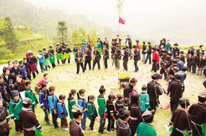 銅鑼、八仙、蘆笙一齊奏起的時候,“招龍”儀式正式開始。只見幾位身著長袍馬褂的寨老帶著全寨男女老幼威風(fēng)凜凜地列隊(duì)走向蛙公,然后列隊(duì)站在招龍師的身后,聽招龍師唱詞。祭師大喊3聲“保寨蛙公龍神君,請回來吧”!全部參加人員用苗語喊“保寨蛙公龍神君,請回來吧”!蒼涼的這3聲長吼劃破了長空。接著請主事殺牲祭龍,最后大家就地聚餐,叫做“熱鬧蛙公”。