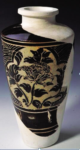 西夏經(jīng)瓶是靈武窯最具特色的西夏器類之一,其器型瘦長(zhǎng),肩部最寬,下腹?jié)u收,平底,假圈足;胎質(zhì)細(xì)膩致密,外壁施釉均不到底,內(nèi)壁施滿釉,釉色以褐釉為主,也有黑釉,白釉少見,白釉瓷均施化妝土;紋飾以牡丹花為主,也有菊花,少見海棠花,輔紋以海水波浪紋和斜線紋為主,花紋細(xì)膩,構(gòu)圖流暢,疏密得當(dāng);整體構(gòu)圖大量使用開光,搭配合理,講究對(duì)稱。