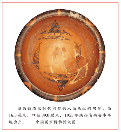 在中國(guó)國(guó)家博物館的展廳中,既有陜西半坡出土的人面魚(yú)紋彩陶盆、陜西華州區(qū)出土的鷹形陶鼎、河南賈湖出土的七孔骨笛、內(nèi)蒙古翁牛特旗出土的紅山玉龍、甘肅出土的馬家窯文化渦紋四系彩陶罐,也有山西襄汾陶寺出土的陶壺、浙江良渚出土的雙鼻陶壺、四川廣漢三星堆出土的青銅面具……