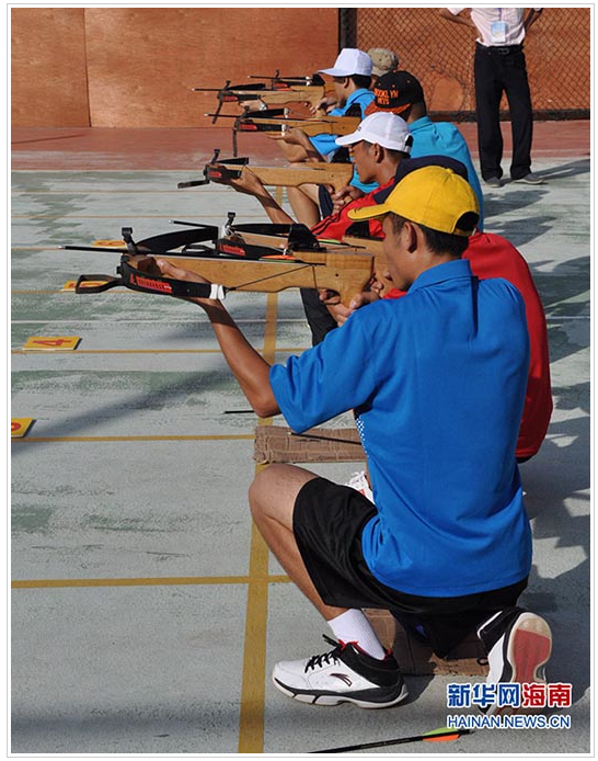 海南省第五屆少數(shù)民族傳統(tǒng)體育運(yùn)動會比賽項目之一——射弩(新華網(wǎng) 圖)