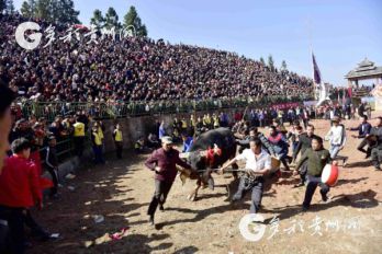 貴州省從江縣第十五屆原生態(tài)侗族大歌節(jié)的前一天,恰逢該縣逢亥斗牛日,丙妹鎮(zhèn)松學(xué)斗牛塘、谷坪鄉(xiāng)四寨河斗牛塘同時舉辦傳統(tǒng)牛王爭霸賽,喜迎一年一度“侗族大歌節(jié)”的到來,共有來自周邊村寨的80頭水牯牛參戰(zhàn),斗牛活動場上名牛角逐,場面異彩紛呈,吸引數(shù)萬名觀眾前來觀戰(zhàn)。