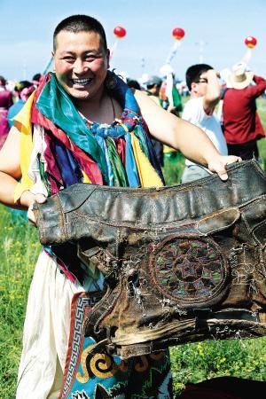 當然,后來那達慕增加了許多新項目,比如賽駱駝、提水、縫蒙古袍扣子、撿牛糞、打斷牛骨比賽、蒙古象棋比賽、沙嘎(羊拐)比賽等。在北京舉辦的那達慕里,還融入了現代三大球類比賽項目,為了集體參與,增加了拔河比賽、扔沙包、服飾比賽、兒童說蒙古語比賽、兒童唱歌比賽等。