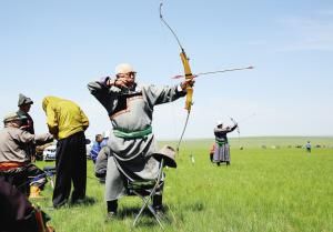 射箭是借助弓的彈力將箭射出,分為射遠、射準。最早用來狩獵,之后用于戰(zhàn)爭,最后才成為體育運動。在蒙古高原的很多巖畫里,都有射箭的圖案。與馬的馴服使用一樣,弓箭的使用增加了人類征服自然的威力和自信。