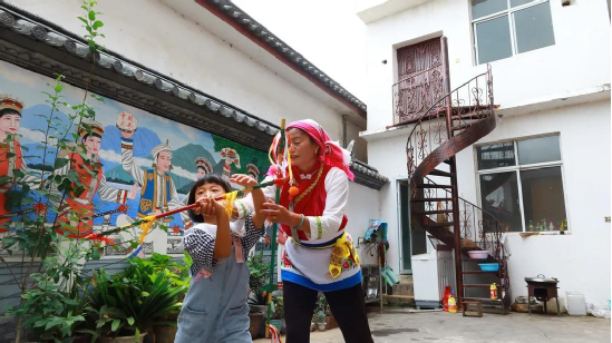 何松康,白族霸王鞭州級(jí)代表性傳承人,也是白族霸王鞭傳習(xí)所的負(fù)責(zé)人,傳習(xí)所就建在她們家一樓的堂屋里。