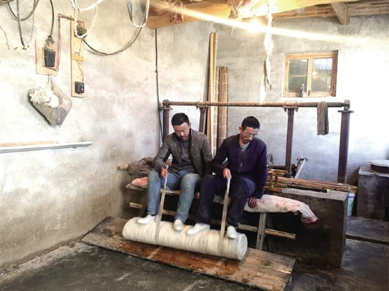 接著,父子幾人配合著,開始蹬簾子步驟?!皳{簾子的步驟最關(guān)鍵?!倍藕C髡f,蹬簾子的時(shí)候,蹬的時(shí)間長(zhǎng)了不行,短了也不行,要掌握好時(shí)間,才能達(dá)到最好的效果?!澳亩夹枰?xì)化,稍不精細(xì)就會(huì)出現(xiàn)氈散了、爛了,做不成功就廢了?!闭f著,杜占財(cái)和杜占福在杜海明的帶領(lǐng)下,三人用雙腳,來來回回仔細(xì)地進(jìn)行著搟簾子。
