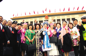 十三屆全國人大一次會(huì)議開幕前,少數(shù)民族代表身著盛裝,在人民大會(huì)堂前留影。 本報(bào)記者 張國欣攝