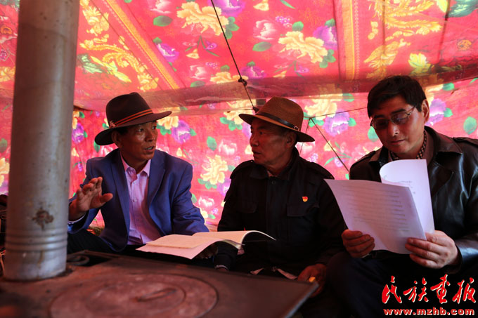 土旦(左)入戶向牧民宣傳草原法律法規(guī)和國家相關(guān)草原保護(hù)政策(黃若天 攝影)
