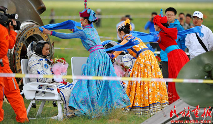 2013年6月26日,神舟十號返回艙平安返回,圓滿完成任務(wù)的三位航天員張曉光、聶海勝、王亞平自主出艙后接受蒙古族牧民的祝賀(吳運(yùn)生 攝影)