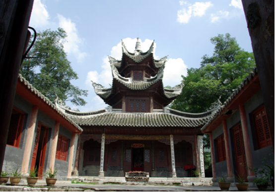 冠山,位于貴州龍里冠山盆地(縣城)東隅,巖山形似金鐘撲地,古木參天,蔥郁蒼翠。明永樂七年(1409)始建的道教活動場所掩蔽其中,可謂“山不在高有仙則名”。在歷史的長河中,雖然道教一去不復返,但其紫虛觀主體建筑保存尚好,現(xiàn)列為省級文物保護單位,由主體建筑紫虛閣、左右?guī)?、前殿、山門、文昌祠組成二進院式古建筑群。主體建筑為木構(gòu)穿斗式三重檐六角攢尖筒瓦頂,1989年遷入的文昌祠,為木構(gòu)抬梁式歇山青瓦頂,帶吻正脊,戧脊翹角卷草,石質(zhì)柱礎浮雕仙草、竹、梅、鹿等圖案。西南兩面有1936年題刻的“還我河山”、“巨靈一孹”等七方摩崖石刻。建筑物的形制、布局給人一種古樸、滄桑之感。登閣騁目,遠山峻嶺和鱗次櫛比的樓房盡收眼底,讓人流連忘返。