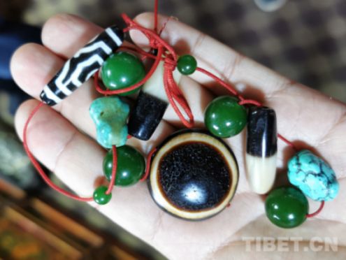 商家們一般把天珠分為幾類。第一類是印度的天珠,經(jīng)營(yíng)這類天珠的商家很少,這些珠子也主要是賣給游客,要價(jià)一般每顆在150-300元之間。第二類是臺(tái)灣天珠,經(jīng)營(yíng)者較多,多數(shù)商家將其看作普通飾品,目標(biāo)群體也主要是游客,每顆的價(jià)格在50-800元之間。第三類,也就是在那里大家常說(shuō)的“真天珠”或“老天珠”,價(jià)格每顆一般從幾千元起,至幾十萬(wàn)元不等。當(dāng)然,在第三類中,除了天地珠、虎牙珠等花紋形式外,天珠上“眼睛”的數(shù)量也很重要,一般地,好天珠上的眼睛越多,價(jià)格最高。在當(dāng)?shù)厣碳液娃r(nóng)牧民看來(lái),一顆上好的九眼天珠真的是價(jià)值連城。
